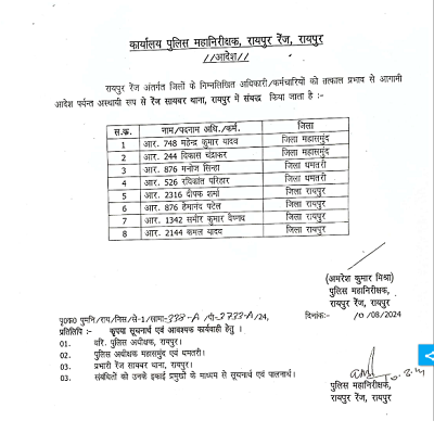 रायपुर। रायपुर संभाग के गरियाबंद, बलौदाबाजार, महासमुंद और रायपुर जिलों में तैनात 102 पुलिसकर्मियों के तबादले किए गए हैं। इन तबादलों में एएसआई, हेड कांस्टेबल और कांस्टेबल रैंक के अधिकारी-कर्मचारी शामिल हैं। इस संबंध में रेंज आईजी अमरेश मिश्रा द्वारा आदेश जारी किया गया है।