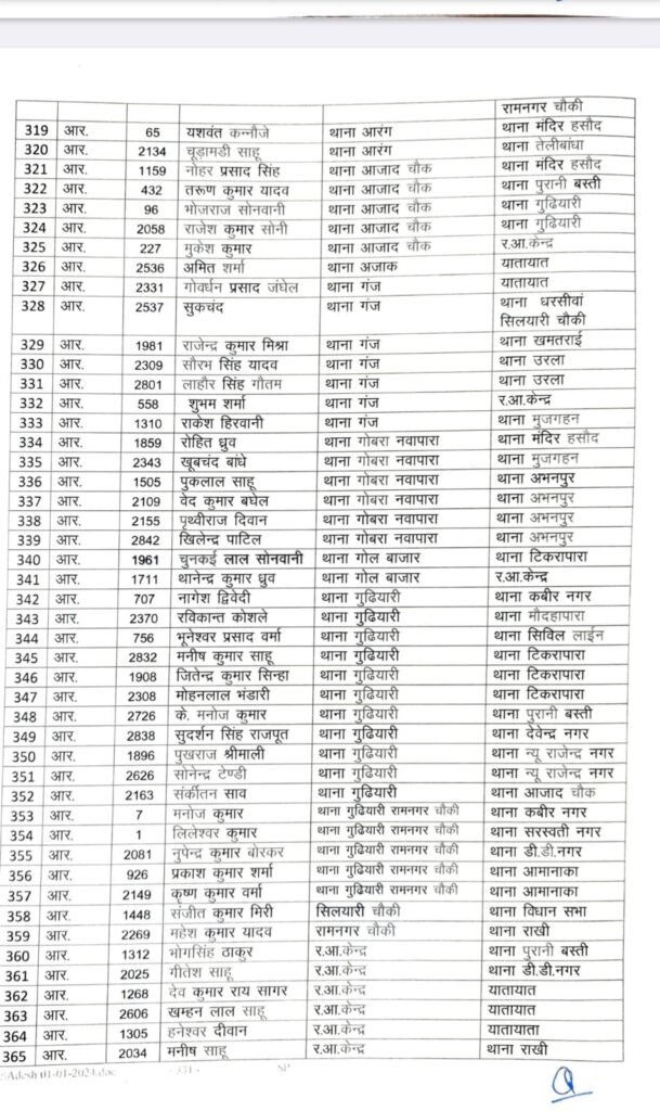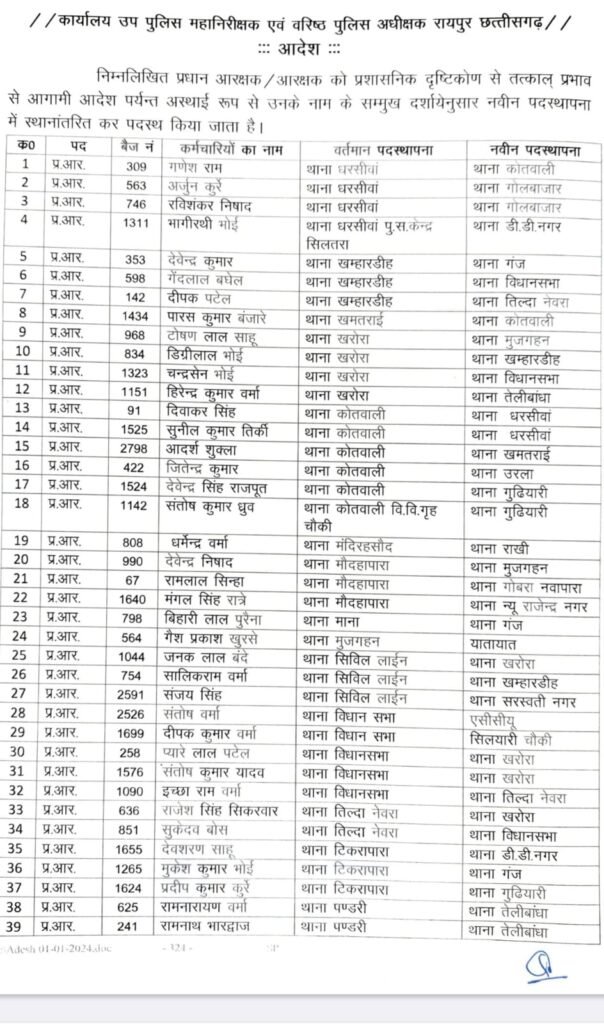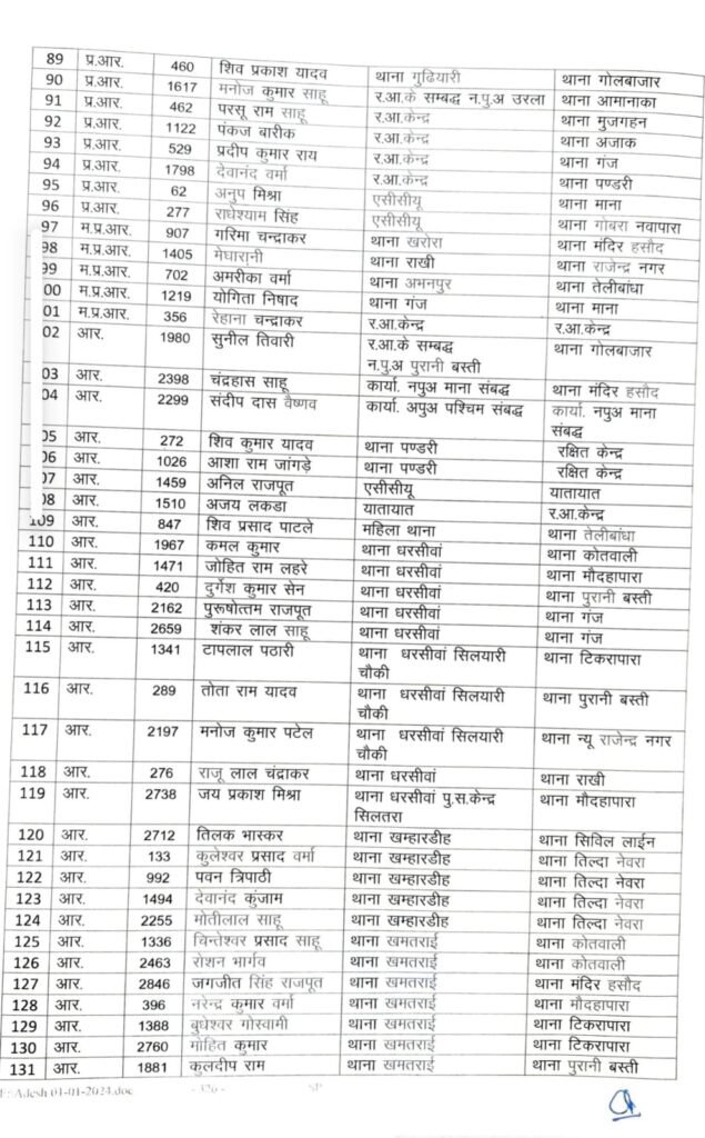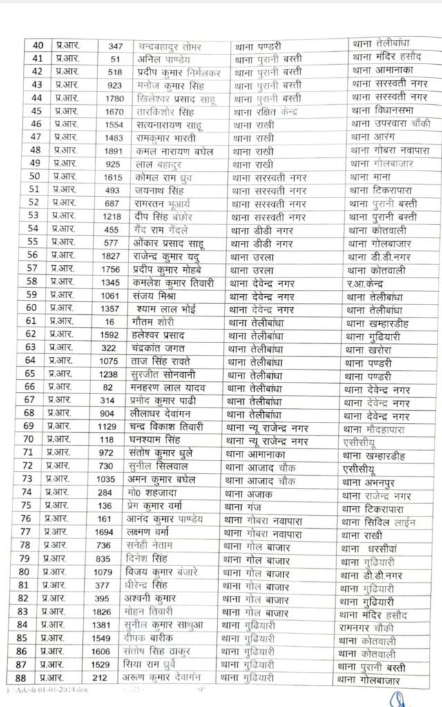 प्रधान आरक्षक गणेश राम को थाना धरसीवां से हटाकर राजधानी के कोतवाली थाने में लाया गया है. प्रधान आरक्षक अर्जुन कुर्रे को थाना धरसीवा से हटाकर थाना गोल बाजार रायपुर पदस्थ किया गया है. प्रधान आरक्षक रवि शंकर निषाद को थाना धरसीवा से गोल बाजार थाना भेजा गया है. प्रधान आरक्षक देवेंद्र कुमार को थाना खमारडीह से हटाकर थाना गंज भेजा गया है. प्रधान आरक्षक डिग्री लाल भोई को थाना खरोरा से हटाकर थाना खमारडिह किया गया है. प्रधान आरक्षक दिवाकर सिंह को थाना कोतवाली से हटकर थाना धरसीवा ट्रांसफर किया गया है. प्रधान आरक्षक जितेंद्र कुमार को थाना कोतवाली से हटकर थाना उरला भेजा गया है. प्रधान आरक्षक धर्मेंद्र वर्मा को थाना मंदिर हसौद से हटाकर थाना राखी भेजा गया है. प्रधान आरक्षक शालिक राम वर्मा को थाना सिविल लाइन से हटाकर थाना खमारडिह भेजा गया है.