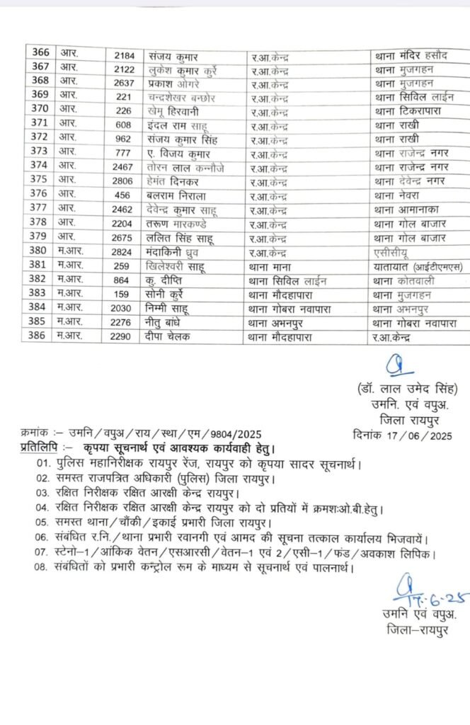 आरक्षक भूपेंद्र कुमार सिंह को थाना डीडी नगर से हटाकर थाना न्यू राजेंद्र नगर तबादला किया गया है. आरक्षक नरेश प्रधान को थाना उरला से हटकर थाना कोतवाली भेजा गया है. आरक्षक विनोद कुमार दुबे को थाना उरला से तबादला करके उन्हें राजधानी के पुरानी बस्ती थाना भेजा गया है. आरक्षक सुभाष चंद्राकर को थाना देवेंद्र नगर से हटकर थाना सिविल लाइन भेजा गया है. आरक्षक संदीप सिंह को थाना देवेंद्र नगर से हटकर थाना पंडरी भेजा गया है. आरक्षण रूपचंद बर्मन को थाना तेलीबांधा से तबादला करके थाना खरोरा भेजा गया है. आरक्षक सुनील चंदेल को थाना तेलीबांधा से हटकर थाना सिविल लाइन तबादला किया गया है.