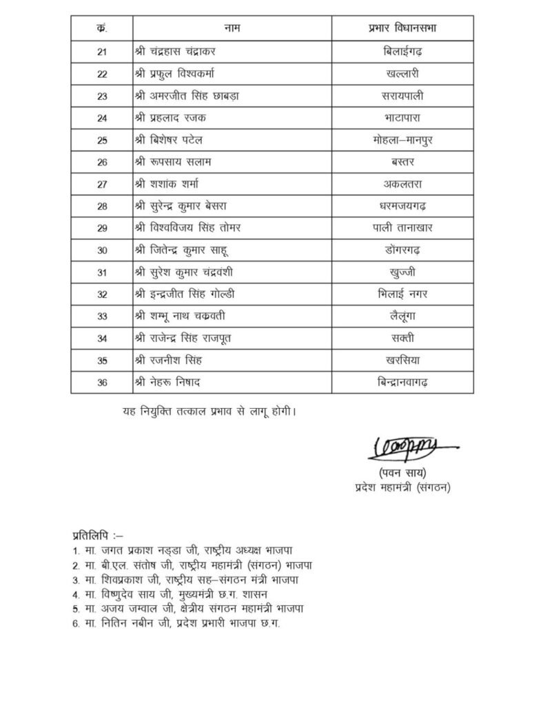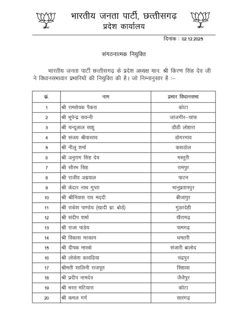 रायपुर :- भारतीय जनता पार्टी छत्तीसगढ़ के प्रदेश अध्यक्ष किरण देव ने विधानसभावार प्रभारियों की नियुक्ति की है। जो निम्नानुसार है :-