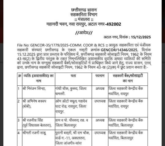 छत्तीसगढ़ :- राज्य सरकार ने चार जिला सहकारी बैंक में अध्यक्ष सदस्यों की नियुक्ति की है। जिसका आदेश भिजारी कर दिया गया है। सहकारिता विभाग से जारी आदेशानुसार बिलासपुर बैंक में पूर्व विधायक रजनीश सिंह अध्यक्ष, रजनी साहू उपाध्यक्ष, राजनांदगांव में सचिन सिंह बघेल अध्यक्ष पूर्व महामंत्री भाजपा भरत वर्मा उपाध्यक्ष, दुर्ग प्रीतपाल बेलचंदन अध्यक्ष, नरेश यदु उपाध्यक्ष, अंबिकापुर राकिशुन सिंह अध्यक्ष जगदीश साहु उपाध्यक्ष, और जगदलपुर में पूर्व सांसद दिनेश कश्यप अध्यक्ष श्रीनिवास मिश्रा उपाध्यक्ष नियुक्त किए गए हैं। सरकार बनने के बाद से कलेक्टर की अध्यक्षता में बैंक संचालित हो रहे थे।