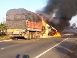 बलरामपुर:- बलरामपुर जिले के त्रिकुंडा थाना क्षेत्र अंतर्गत महुली के पास शुक्रवार को वाड्रफनगर-रामानुजगंज मुख्य मार्ग पर क्लिंकर से लदे ट्रक और चावल से भरे ट्रक के बीच आमने-सामने की जोरदार टक्कर हो गई। टक्कर इतनी भीषण थी कि क्लिंकर लोड ट्रक में अचानक आग लग गई और ट्रक चालक आग की चपेट में आकर जिंदा जल गया।