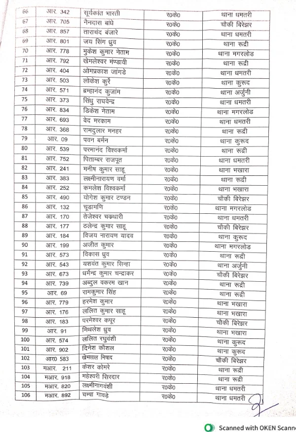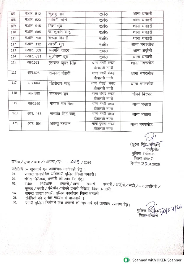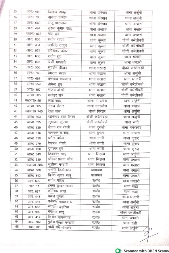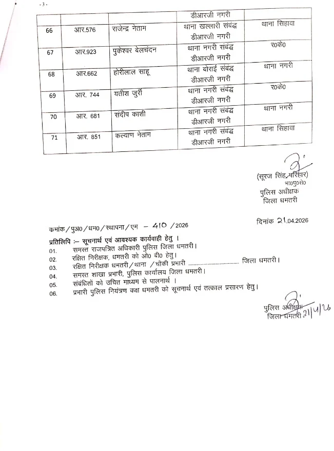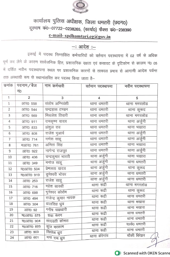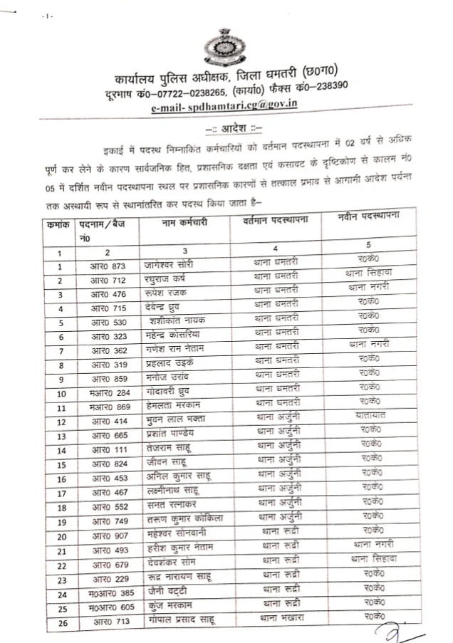 धमतरी :- पुलिस विभाग में एक बड़ा प्रशासनिक बदलाव देखने को मिला है। दो साल से अधिक समय से एक ही स्थान पर पदस्थ आरक्षकों का थोक में तबादला किया गया है। इस प्रक्रिया के तहत कुल 192 आरक्षकों का स्थानांतरण विभिन्न थाना-चौकियों और इकाइयों में किया गया है। इस पहल को पुलिस विभाग में पारदर्शिता और कार्यकुशलता बढ़ाने की दिशा में महत्वपूर्ण कदम माना जा रहा है।