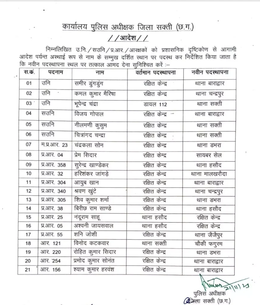 सक्ती:- जिले के पुलिस विभाग में बड़ा उलटफेर हुआ है। एसपी प्रफुल्ल ठाकुर ने चार्ज लेने के बाद पहली बार 21 पुलिसवालों का ट्रांसफर कर दिया है। इस लिस्ट में 3 सब-इंस्पेक्टर, 3 असिस्टेंट सब-इंस्पेक्टर, 9 हेड कांस्टेबल और 4 कांस्टेबल शामिल हैं।