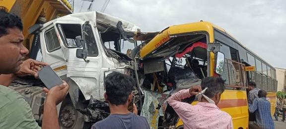जांजगीर-चांपा :- चांपा में आज बड़ा सड़क हादसा होते-होते टल गया। हसदेव पब्लिक स्कूल की बच्चों से भरी बस को एक तेज रफ्तार ट्रेलर ने पीछे से टक्कर मार दी। बस में करीब 50 से अधिक स्कूली बच्चे सवार थे। गनीमत रही कि इस हादसे में कोई बड़ी जनहानि नहीं हुई और सभी बच्चे सुरक्षित हैं। हालांकि, टक्कर के कारण कई बच्चों को हल्की चोटें आई हैं, जिससे मौके पर अफरा-तफरी का माहौल बन गया।