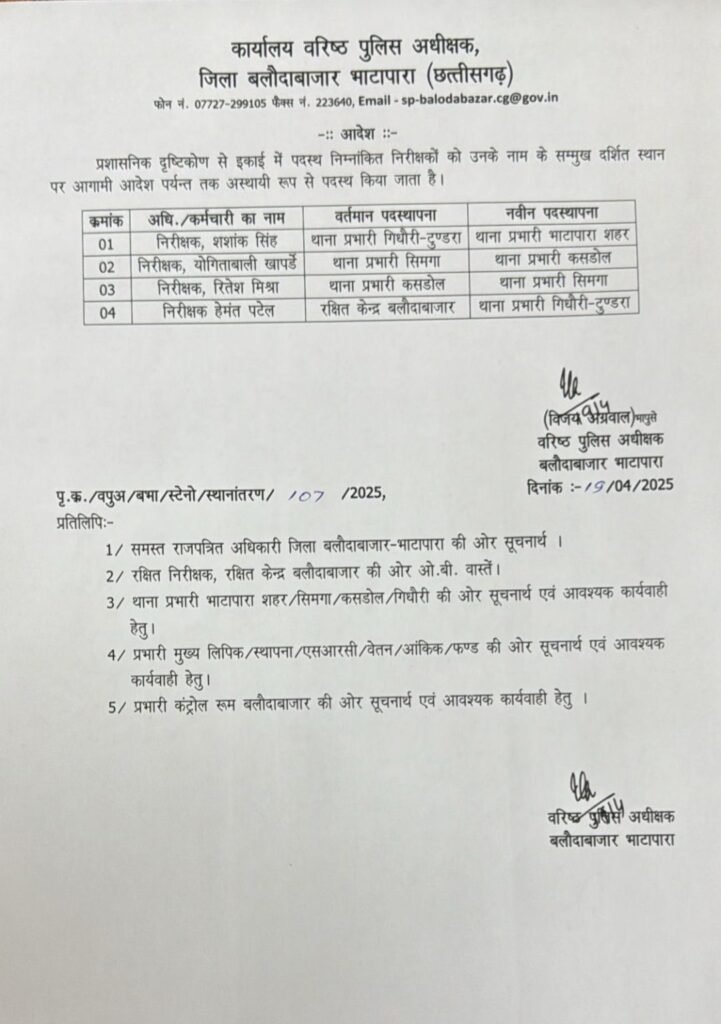 Police Transfer : बलौदाबाजार जिले के पुलिस विभाग में एक बार फिर बड़ा प्रशासनिक बदलाव देखने को मिला है। जिले के वरिष्ठ पुलिस अधीक्षक विजय अग्रवाल ने चार निरीक्षकों के तबादले का आदेश जारी किया है। इस आदेश के अनुसार, जिले के प्रमुख थानों में नए थाना प्रभारियों की तैनाती की गई है, जिससे स्थानीय स्तर पर पुलिसिंग व्यवस्था को नए सिरे से मजबूत करने की कोशिश की जा रही है।