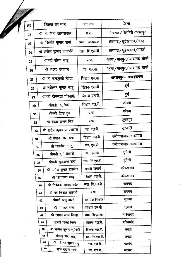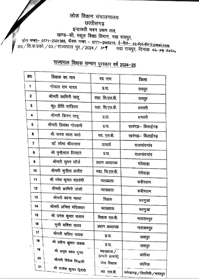 डीपीआई ने चयनित शिक्षकों को सम्मान लेने के लिए 4 सितंबर को रायपुर में उपस्थित होने को कहा है। इसे लेकर सभी डीईओ को निर्देश जारी कर दिया गया है।