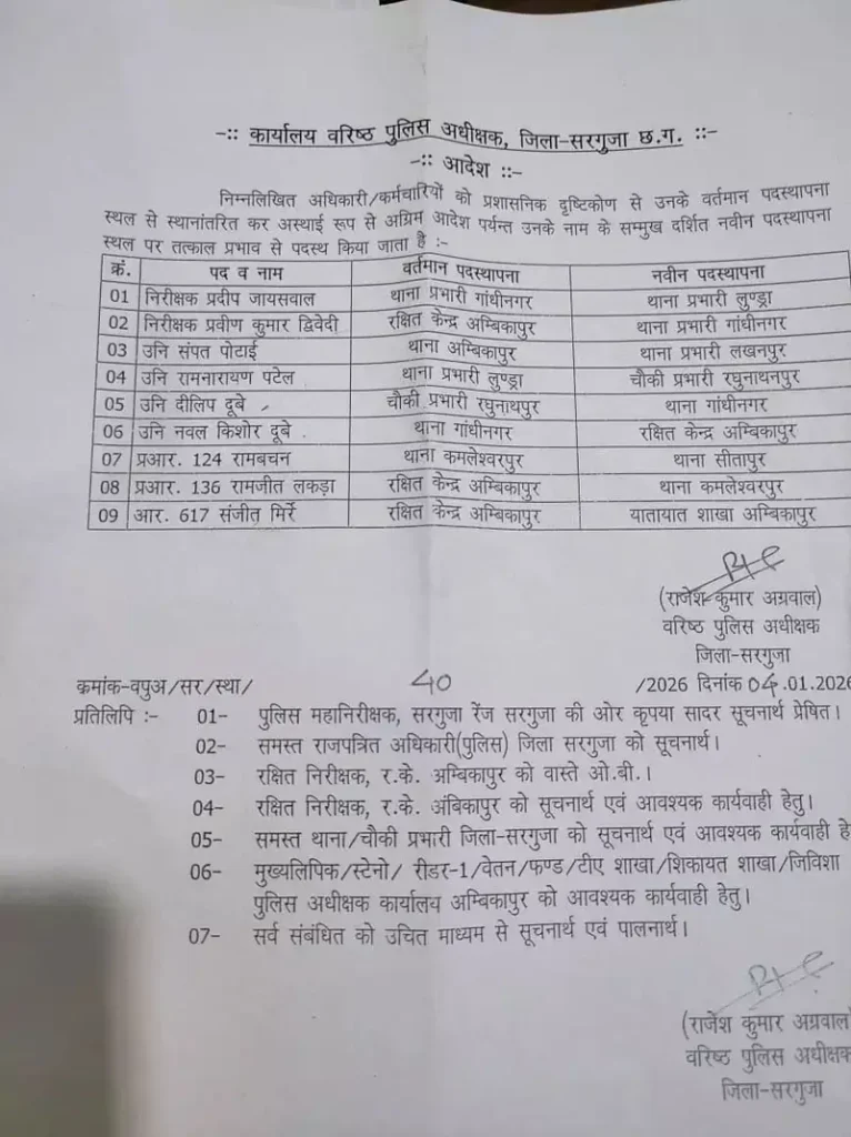 अंबिकापुर :- छत्तीसगढ़ के सरगुजा जिले के पुलिस महकमे में एक बार फिर बड़ा फेरबदल हुआ है। जिले क कई थानों और चौकियों के प्रभारियों को बदल दिया गया है। एक साथ 9 पुलिसकर्मियों को इधर से उधर किया गया है। इस संबंध में एसएसपी राजेश कुमार अग्रवाल ने आदेश जारी कर दिया है। जारी आदेश के अनुसार निरीक्षक प्रदीप जायसवाल को गांधीनगर थाने से हटाकर लुंड्रा थाने का प्रभारी बनाया गया है। वहीं प्रवीण कुमार द्विवेदी को गांधीनगर थाने की जिम्मेदारी दी गई है। अंबिकापुर थाने के संपत पोटाई को लखनपुर थाने का प्रभारी बनाया गया है।